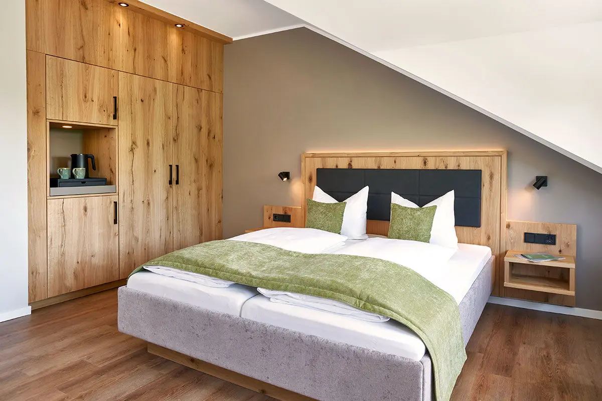 Hier haben wir ein Upgrade - für unsere Gäste mit gehobenen Ansprüchen. Alle Suiten verfügen über einen modischen Look. Hochwertige Materialien gepaart mit modernen Möbeln in grün und einem üppigem Platzangebot, so präsentieren sich Ihnen unsere Komfort Suiten. Auf mindestens 50 m² erwartet Sie eine stilvolle Einrichtung mit einem großzügigen Wohnzimmer und separatem Schlafzimmer.